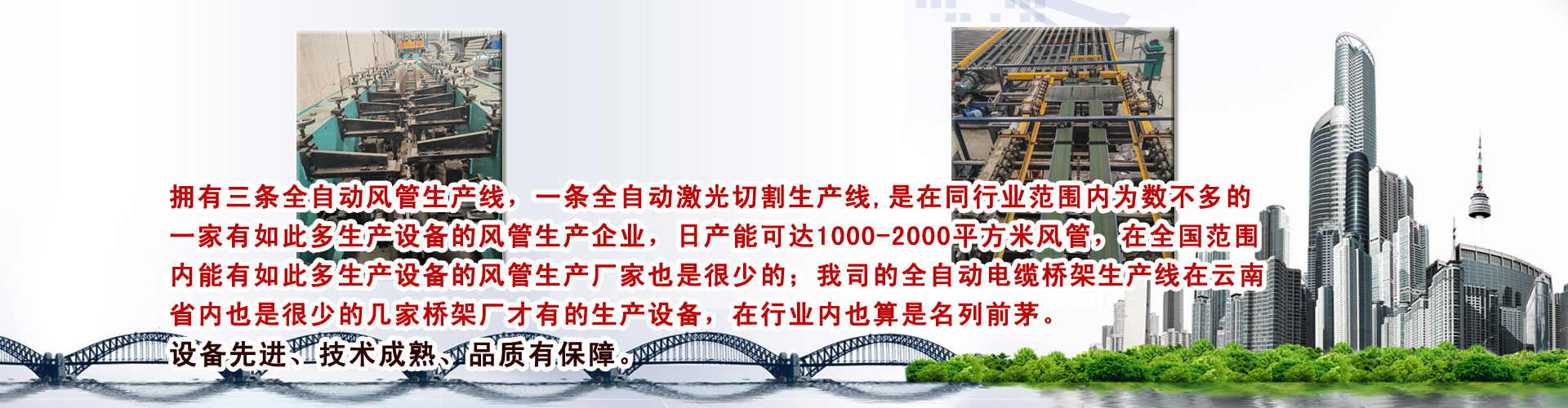 云南大军暖通设备工E有限公司是一家专业生产通风道、通风讑֤、电~桥架的风管加工厂家。云南大军暖通专业从事:风管加工、通风道、通风讑֤Q风机、风阀、风口、消声器、防火阀Q、电~桥架、PP风管、镀锌板、通风净化系l的Ҏ设计、销售选型、施工调试、售后保L务? 云南大军暖通设备工E有限公司成立于2016q?2?2日,现已拥有三条全自动风生产线Q一条全自动Ȁ光切割生产线,是在同行业范围内为数不多的一家有如此多生产设备的风管生企业Q日产能可达1000-2000qxc风,在全国范围内能有如此多生产设备的风管生厂家也是很少的;我司的全自动늼桥架生U在云南省内也是很少的几家桥架厂才有的生产设备,在行业内也算是名列前茅。设备先q、技术成熟、品质有保障。可为广大客h供更快的生速度Q降低生产成本,提高工作效率Q羃短施工周期? 公司自成立以来,׃直把成ؓ一家积淀深厚的百q老店作ؓq求目标Q努力汇聚业界精英,实时汲取国内外先q的讑֤、材料、技术、信息及理Ҏ和经验,为客h供优质、适用、经的产品、服务及一站式解决ҎQ企业在激烈的市场竞争中始l保持竞争力和敏锐度Q在普遍q求“大而强”的时代里,我们却选择了追求“小而美”。因Z注,所以专?-从而以口碑在行业内牢牢获取了一席之地?